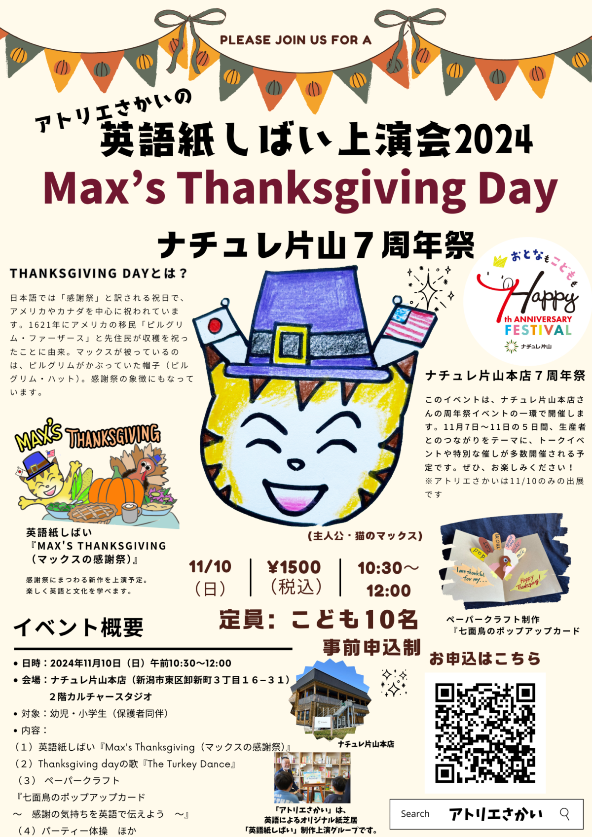 【上演会&イベント】Max’s Thanksgiving day at ナチュレ片山 本イベントは事前お申し込み制です。 お申し込みはこちら 関連 + Add to Google Calendar + iCal / Outlook export 検索 最近の投稿 安心の中で生まれる、子どもたちの笑顔。ウクライナ支援オンライン授業に参加しました 高校生たちのパフォーマンス、素晴らしかった〜!村上市内の高校での出前授業 実践の根源には熱い思いが アートはただ観るだけじゃない 「勉強って意味あるの?」にどう答える?——英語は“人間らしいやりとり”のために AIが絶対にできないこととは 【YouTube】新作の中身を一部公開 伝えたい気持ちが言葉を産む 【重要】LINE誘導型なりすましメールにご注意ください 英語教育のプロフェッショナルの前で、マックスが舞台に立つ