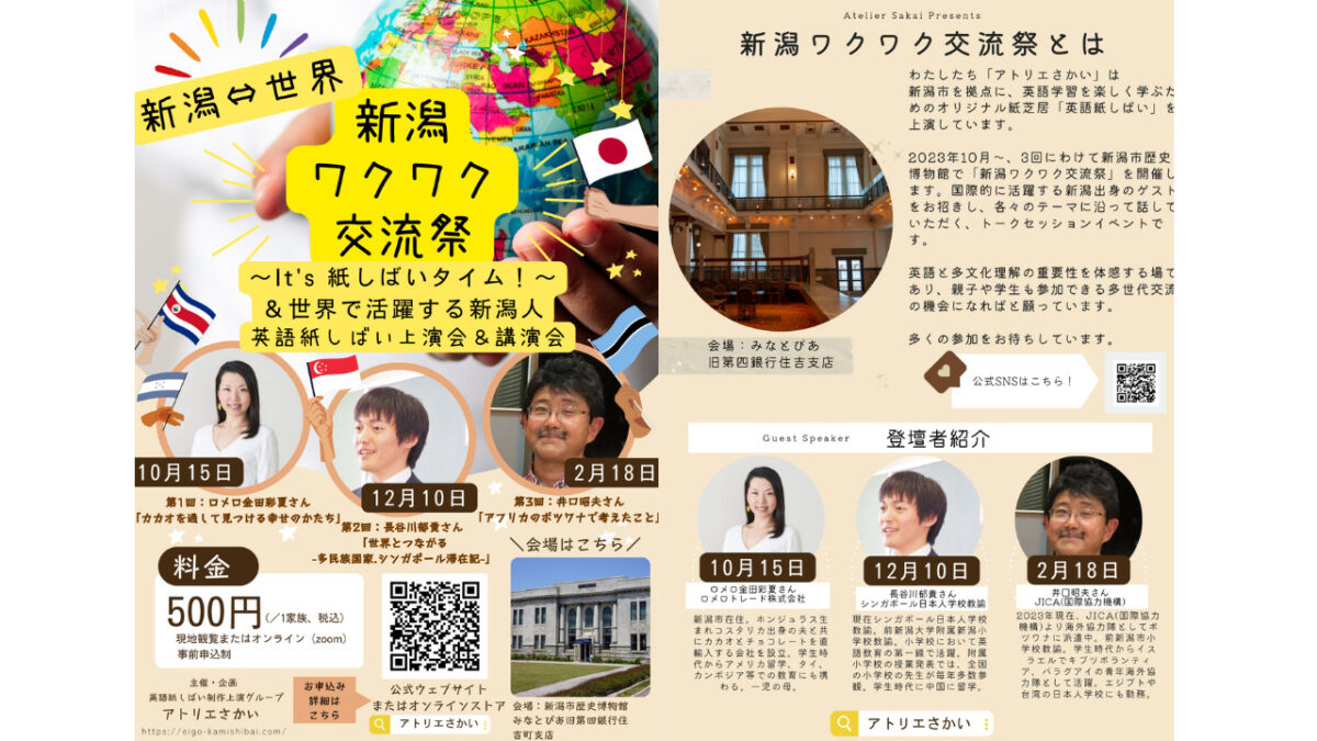 新潟ワクワク交流祭(2) 第2回のチケットは2023年11月〜販売予定です。 お問い合わせは下記から承ります。 氏名 メールアドレス 題名(お問い合わせの内容についてご記入ください。例:「英語紙しばい教材パック購入希望」○月△日開催のイベントについて等) メッセージ本文(お問い合わせの詳細等を自由にご記入ください) Δ 関連 + Add to Google Calendar + iCal / Outlook export Tags: みなとぴあ, イベント, オンライン上演会, 新潟市歴史博物館, 英語紙しばい上演会 検索 最近の投稿 出前授業で高崎市へ。不思議なあたたかさを感じた教育現場でした 【YouTube】NY在住プロダンサー中澤利彦さんとの対談動画を公開 息子と訪れた銭湯で感じた、“AIではつくれない温かさ” まごころ保育園で広がる笑顔と英語の輪 頼もしい学生たちの活躍|こども園への出前授業 【ご来場感謝!】まるごとブックフェスタ2025(会場:BESS新潟さん) 山形遠征ダブルヘッダー、無事終了。 【イベント出演】2025.11.3(月・祝)「まるごとブックフェスタ」BESS新潟住宅展示場 AI時代に問う、「人にしかできないこと」:秋のスクーリング授業レポート(2025) 柿渋の新舞台に、マックス登場!
