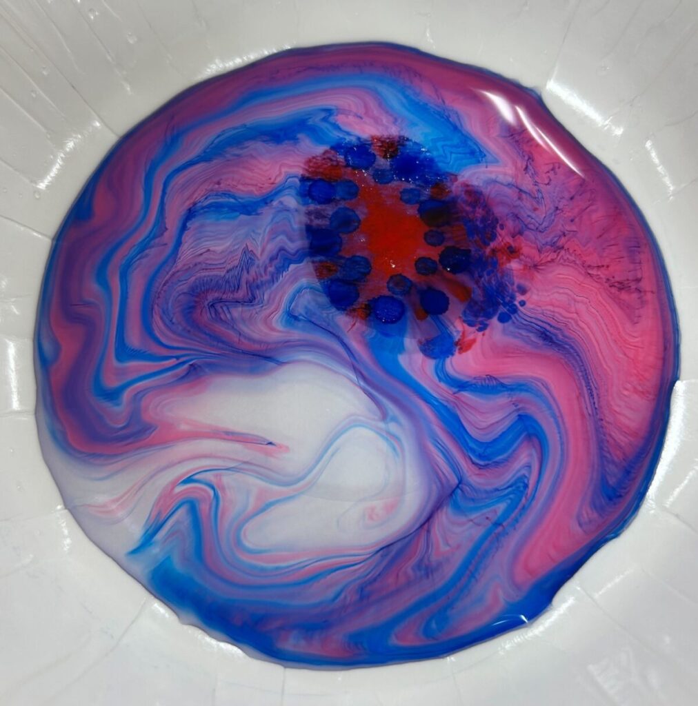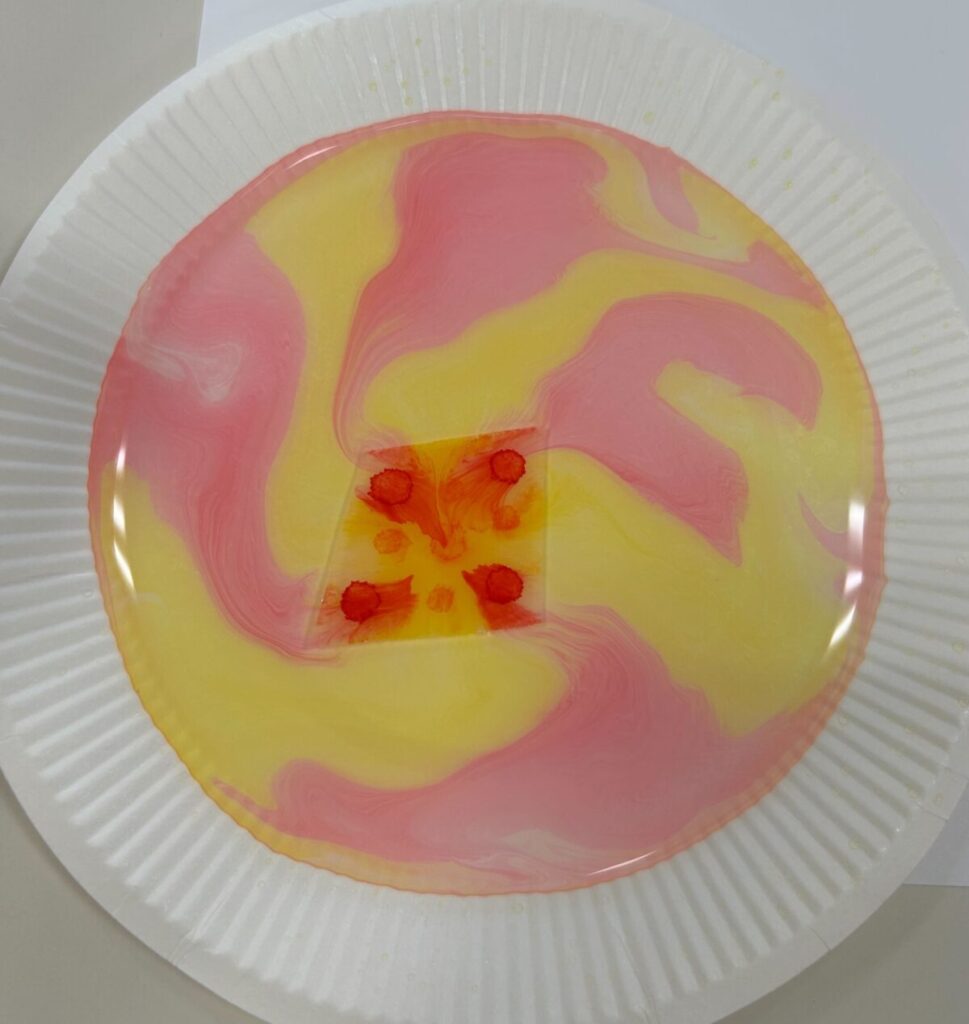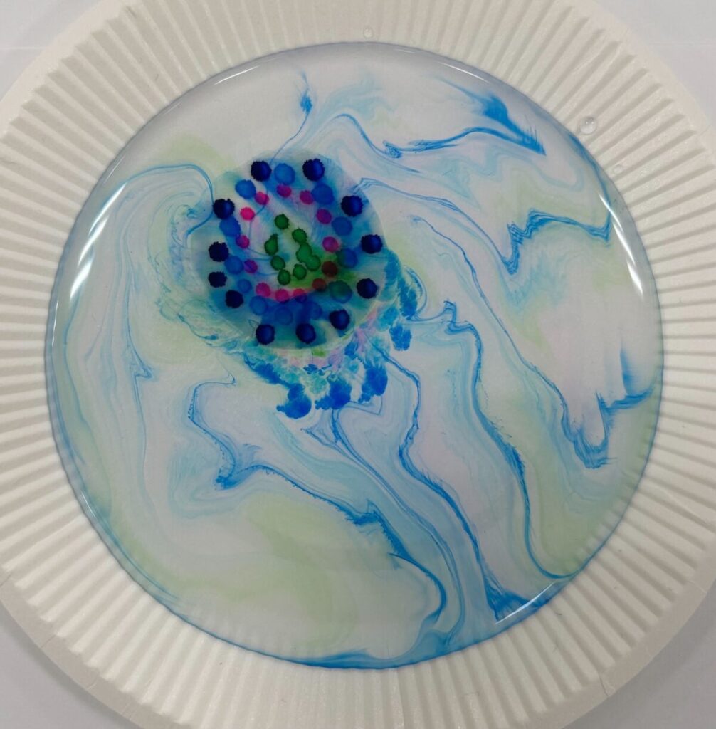 絵の具が水面に広がる瞬間の偶然の美しさに歓声が上がり、自然と笑顔がこぼれる場面も数多くありました。アナログな活動だからこそ、感性や直感、身体の感覚をフルに使って没頭できる時間となりました。